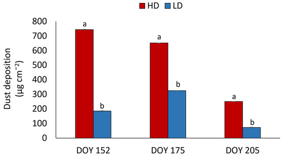 Dust deposited on leaf lamina of R. pseudoacacia HD and LD plants at DOY 152, 175 and 205. Mean values and standard errors are shown. Different letters correspond to statistically significant differences (p < 0.05) within the date of sampling.