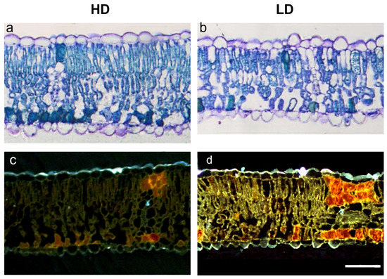 Light (a,b) and epi-fluorescence (c,d) microscopy views of leaf lamina cross-section of R. pseudoacacia HD (a,c) and LD (b,d) plants. Images are at the same magnification; scale bar = 50 µm.