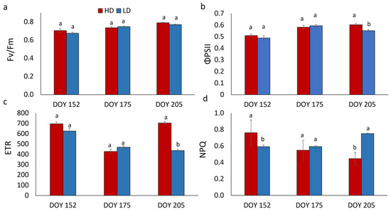 More specifically, ΦPSII and ETR measured at DOY 205 showed higher values in HD compared to LD plants. The NPQ at DOY 152 was significantly higher in HD plants, it did not change between HD and LD at DOY 175, while it was significantly lower in HD plants at DOY 205.