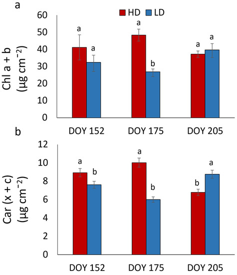 Total chlorophyll (chl a + b) and carotenoid (x + c) contents were higher in HD compared to LD plants at DOY 175 (Figure 4). At DOY 152 and 205, no significant difference in chlorophyll content was found between HD and LD plants, whilst LD leaves exhibited a higher carotenoid concentration than HDs.