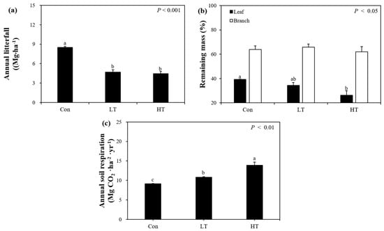 The annual litterfall (Mg·ha−1) (a), the remaining mass of leaf and branch litter (%) following 648 days of decomposition (b), and the annual soil respiration (Mg CO2·ha−1·year−1) (c) of the Con, LT, and HT treatments in a Chamaecyparis obtusa (Siebold and Zucc.) Endl. forest. Vertical error bars indicate standard error, and different letters indicate significant differences among the three thinning intensities.