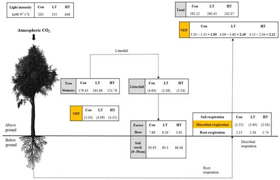 The net ecosystem production (NEP) of a forest ecosystem is determined by the difference between the net primary production (NPP) produced by trees through photosynthesis and C emissions by microbial respiration (Rh) [] (Equation (8)):