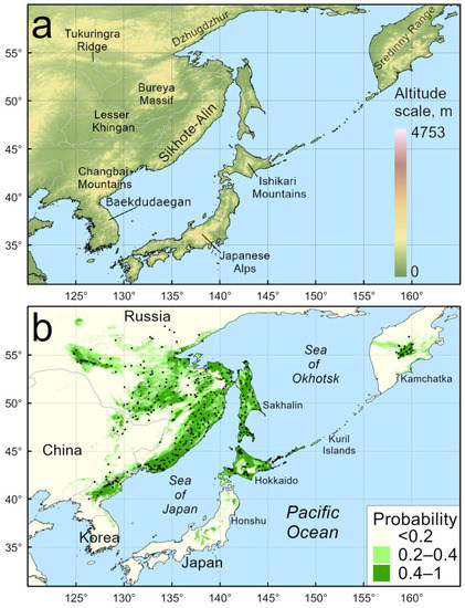 Topography map of the region (a), the built species distribution model of Picea jezoensis (Siebold & Zucc.) Carrière represented as a probability map; black dots indicate presence points in the model train (n = 479) (b).