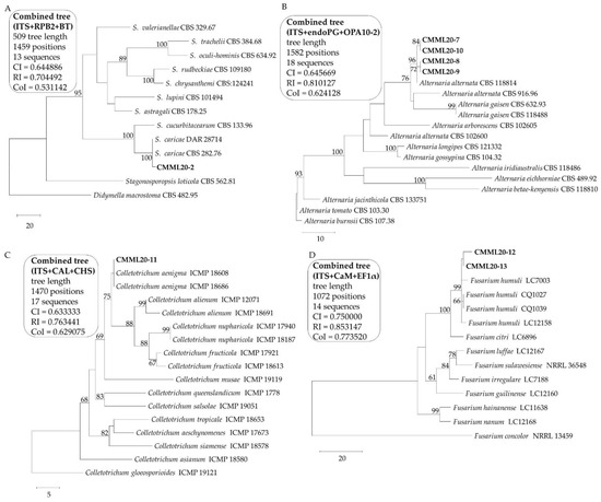 Phylogenetic tree constructed by the maximum parsimony method from alignment of combined datasets (A) CMML20–2, ITS, RPB2, and BT, (B) CMML20–(7–10), ITS, endoPG, and OPA10-2, (C) CMML20–(11–12), ITS, CAL, and CHS, (D) CMML2–12 CAL, CHS, EF1α, RPB2, and BT. The percentage of replicate trees in which the associated taxa clustered together in the bootstrap test (1000 replicates) is shown next to the branches. Bootstrap values >50% are indicated above branches. All positions containing gaps and missing data were eliminated. The isolates in this study are marked in bold.