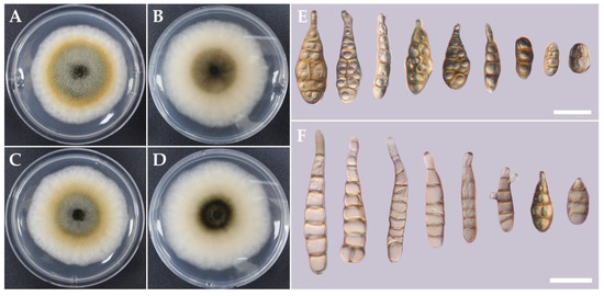 Obverse and reverse colony characteristics of CMML20–7 and CMML20–8 isolates on PDA at 25 °C for 7 days (A–D). Different conidial sizes and shapes are observed under the microscope (E,F). Scale bars (E,F) = 20 μm.