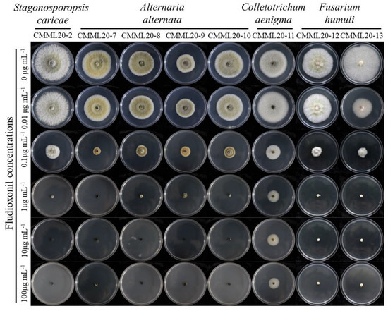 Anterior view of colonies of all fungal isolates on non-supplemented PDA and supplemented with 0.01, 0.1, 1, 10, or 100 μg mL−1 of fludioxonil.