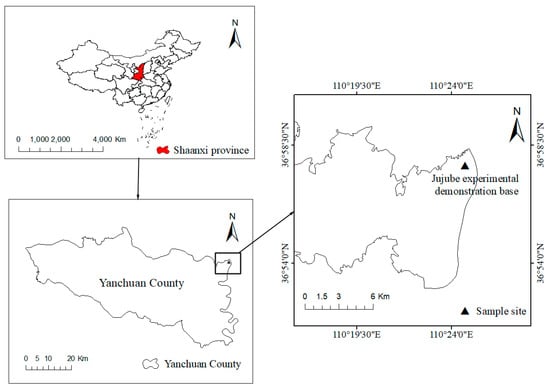 The study area was at the Qijiashan jujube experimental demonstration base (36°57′ N, 110°29′ E) in Yanchuan County, Shaanxi Province, China (Figure 1). It is a loess hilly and gully region with an average altitude of 850 m. The annual average temperature was 10.8 °C, the average duration of sunlight was 2558 h, the mean frost-free period was 185 days, the annual average precipitation was 500 mm, and the rainfall was mainly concentrated between July and September, corresponding to the temperate continental monsoon climate. The vegetation in the study area mainly comprised Zizyphus jujube Mill, Malus pumila Mill, and Ziziphus jujuba Mill. var. spinosa. The herbs grown in the regions mainly comprised Artemisia sacrorum Ledeb. and Heteropappus hispidus (Thunb.) Less.