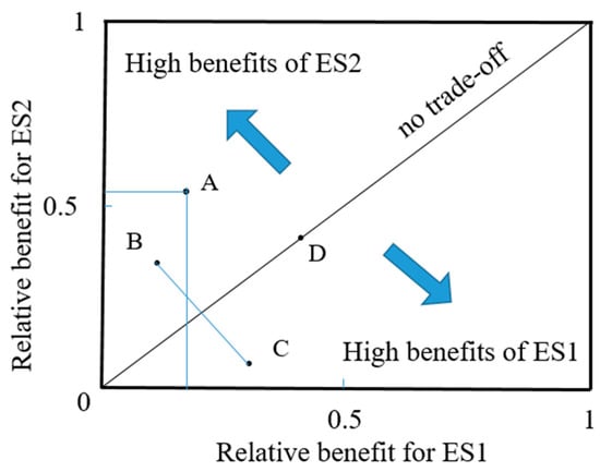 Describe the trade-off between two ecosystem services (ESs). Point B favors ES2 and point C favors ES1. Points B and C are at the same distance from the trade-off bisector and have equal trade-off values, but the trade-off value is less than point A. Point D has a zero trade-off value.