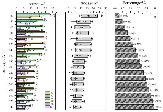 (a) Changes in soil organic carbon storage (SOCS) of different vegetation types; different capital letters indicate significant differences in SOCS of different vegetation types in the same soil layer (p < 0.05). (b) Distribution of total SOCS and (c) percentage of accumulated SOCS in different vegetation types. The center line and empty squares represent the median and mean values, respectively.