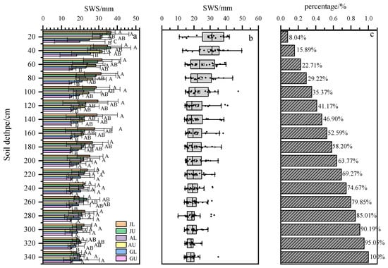 (a) Changes in soil water storage (SWS) of different vegetation types; different capital letters indicate significant differences in SWS of different vegetation types in the same soil layer (p < 0.05). (b) Distribution of total SWS and (c) percentage of accumulated SWS in different vegetation types. The center line and empty squares represent the median and mean values, respectively.