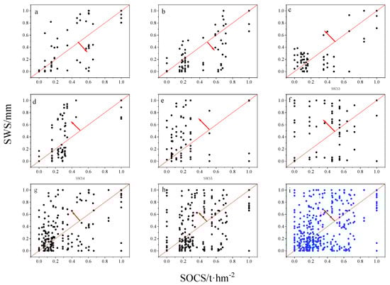The trade-off between soil organic carbon storage (SOCS) and soil water storage (SWS). The relative benefits of SOCS and SWS in (a) JL, (b) JU, (c) AL, (d) AU, (e) GL, and (f) GU are expressed by black points. (g,h) The relative benefits of SOCS and SWS in level terraces and undisturbed slopes. (i) The relative benefits throughout the region are expressed by blue points. The vertical distance between the point and the 1:1 line represents the degree of compromise, and the direction of the arrow indicates which ES is more efficient.