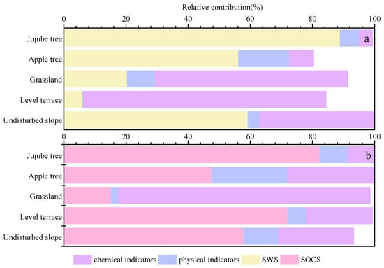 Soil layer: 0–340 cm. (a) The relative contribution of soil water storage (SWS), physical indicators (soil bulk density, saturated water content, capillary water holding capacity, total porosity), and chemical indicators (available nitrogen, available phosphorus, available potassium, soil pH, electrical conductivity) to soil organic carbon storage (SOCS), and (b) the relative contribution of SOCS, physical indicators, and chemical indicators to SWS.
