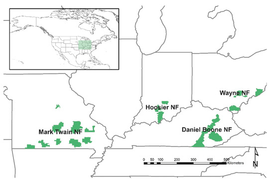 Stands were selected from four national forests in the CHR: the Mark Twain National Forest (MTNF) in southern Missouri, the Hoosier National Forest (HNF) in southern Indiana, the Wayne National Forest (WNF) in southern Ohio and the Daniel Boone National Forest (DBNF) in eastern Kentucky (Figure 1). These four forests/districts lie between 36.75° and 40.75° N latitude and 81.80° and 90.80° W longitude and represent a broad range of edaphic and climatic conditions within the CHR. Detailed descriptions of these forests have been provided elsewhere [28,30].