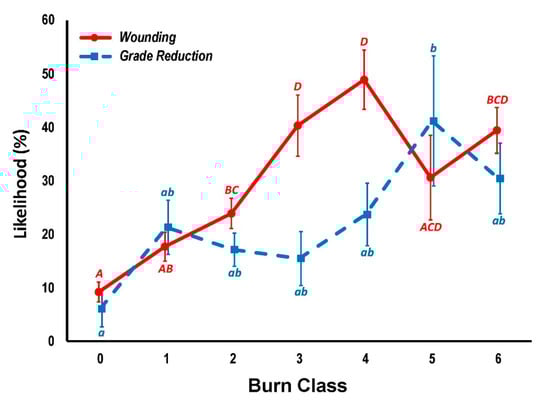 The likelihood of wounding (red) and conditional likelihood of grade reduction assuming wounding (blue) with increasing burn class (i.e., numbers of prescribed fires). Error bars are ±1 standard error. Letters indicate significant differences (p < 0.05, Tukey’s HSD) among mean likelihoods of the burn classes for both wounding (capitalized, red) and grade reduction (lower case, blue).