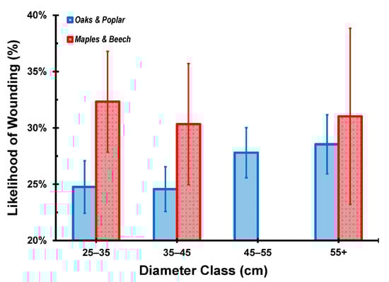 The likelihood of wounding by increasing 10 cm diameter class, as separated by thick-barked (oaks and yellow-poplar; blue) and thin-barked (maples and American beech; red) species. Error bars are ± 1 standard error. There are no significant differences (p < 0.05, Tukey’s HSD) among mean likelihoods for either species group. Note that no 45–55 cm diameter, thin-barked species were sampled.