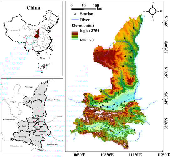 Due to the different completeness of the daily precipitation data of different meteorological stations, we selected 46 stations (Figure 1) with complete daily precipitation data from 1961 to 2005 from all meteorological stations in Shaanxi Province, including 11 stations in northern Shaanxi, 20 stations in Guanzhong and 15 stations in southern Shaanxi. Due to the distribution of the central plain in the Guanzhong area, there were many meteorological stations with high data integrity, so there were many stations available for selection.