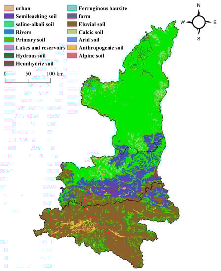 The soil type in Shaanxi Province is shown in Figure 2. The main regional soils in Shaanxi Province are aeolian sandy soil, loess soil, paddy soil, tidal soil, newly deposited soil, marsh soil, saline alkali soil, etc. The zonal distribution of soil in Shaanxi Province is obvious. From the perspective of horizontal differentiation, the northern Shaanxi plateau is a chestnut soil and black loessial soil zone; Guanzhong Basin is a brown cinnamon soil zone; and the mountainous area in southern Shaanxi is a yellow-brown soil and yellow cinnamon soil zone. From the perspective of vertical differentiation, the Qinling Mountains and Daba Mountains are obvious. From the bottom to the top, the north slope of the Qinling Mountains is composed of cinnamon, brown, and dark brown soil that is subalpine meadow soil and primitive soil; the north slope of the Daba Mountain is composed of yellow cinnamon soil, yellow-brown soil, and brown soil from the bottom to the top.