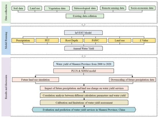 The evaluation and prediction of water yield services in Shaanxi Province mainly include the evaluation of water yield services in Shaanxi Province from 2000 to 2020, and the impact of future precipitation and land use on water yield services in Shaanxi Province. In the discussion, the relationship between different parameters and water yield as well as the calibration and limitations of water yield assessment were discussed. The following is the research flowchart of this paper (Figure 3).