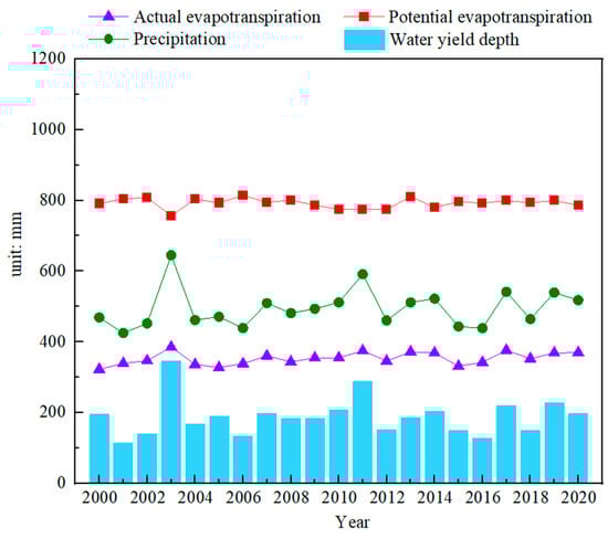 The interannual changes in actual evapotranspiration, potential evapotranspiration, precipitation, and water yield depth in Shaanxi Province from 2000 to 2020 are shown in Figure 4. The multi-year average potential evapotranspiration was 1056.43 mm, and the multi-year average actual evapotranspiration was 470.89 mm, and the changes between the two were relatively stable. The annual precipitation was 659.89 mm, the highest precipitation was 860.39 mm (2003), and the lowest precipitation was 566.99 mm (2001). Compared with evapotranspiration, the annual precipitation showed a more considerable fluctuation, showing an insignificant upward trend. For the interannual changes in actual evapotranspiration and precipitation, it could be seen that the changes in actual evapotranspiration were highly correlated with the changes of precipitation, which meant that most of the precipitation through actual evapotranspiration was due to the atmosphere again. Compared with actual evapotranspiration and potential evapotranspiration, precipitation has the strongest correlation with water yield. In the InVEST model, the water yield follows the principle of water balance. The regional water yield is precipitation minus actual evapotranspiration, but the actual evapotranspiration is also affected by precipitation, so precipitation plays a major role in the water yield. Under the influence of these meteorological elements, the average water yield depth in the study area for many years was 189 mm and the water yield was 387.61 × 108 m3, showing an insignificant upward trend overall. The highest water yield depth in Shaanxi Province was 356.15 mm (2003) and the water yield was 710.77 × 108 m3, and the lowest water yield depth was 114.54 mm (2001) and the water yield was 234.53 × 108 m3; this was consistent with the distribution time of high and low values of precipitation.