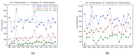 Water yield (a) and Precriptation (b) in northern Shaanxi, Guanzhong, and southern Shaanxi.