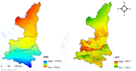 The spatial distribution of precipitation and actual evapotranspiration in Shaanxi Province from 2000 to 2020 is shown in Figure 6. The precipitation data of Shaanxi Province from 2000 to 2020 were cut and synthesized with the national geoscience data center’s 1901–2021 1 km resolution monthly precipitation data set in China.