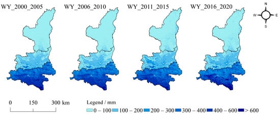 Spatial distribution of water yield depth in Shaanxi Province in 20002005, 20062010, 20112015, and 20162020.