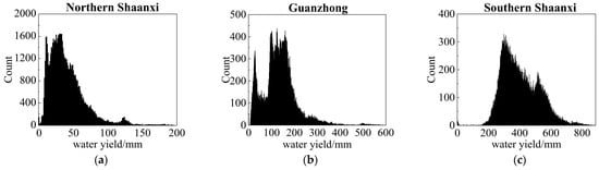Distribution of water yield depth in Northern Shaanxi (a), Guanzhong (b), and Southern Shaanxi (c).