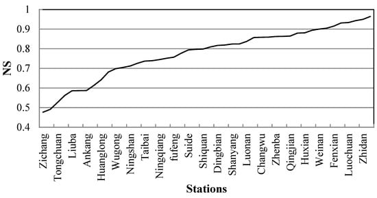 Using the SDSM model to downscale precipitation data, it was first necessary to clarify the statistical relationship between precipitation and related predictors and to determine the parameters required for the operation of the weather generator. Table 3 shows the selection results of predictors for each meteorological station in Shaanxi Province. The established statistical relationship was applied to the NCEP reanalysis data from 1991 to 2005 to generate the daily series of precipitation in this period, and the degree of agreement between the simulated precipitation and the measured precipitation was compared and analyzed. In this paper, the Nash efficiency coefficient (NS) was used to judge the simulation effect; the NS of 20% of the stations was lower than 0.65, meaning the simulation effect was poor, and the NS of 80% of the stations exceeded 0.65, meaning the simulation effect was good; the specific NS coefficient values can be found in Figure 9. Zichang Station and Pingli Station, located in northern and southern Shaanxi, respectively, had the worst simulation effect, with their NS being lower than 0.5. Shenmu, Zhidan, Lintong, Luochuan, and Xi’an Stations had the best simulation effect, with their NS greater than 0.93. The Shenmu, Zhidan and Luochuan Stations are located in northern Shaanxi, and the Lintong and Xi’an Stations are located in Guanzhong. There was no obvious spatial correlation between good and bad sites.