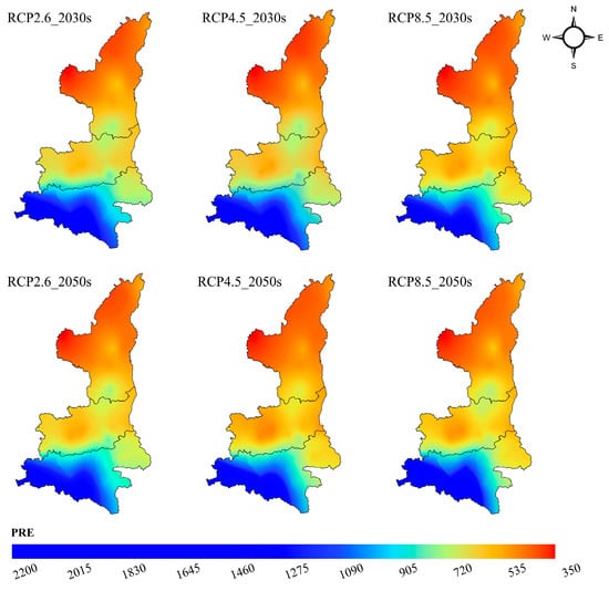 The results showed that the precipitation in Shaanxi Province would increase from south to north in space in the future. The temperature obtained from the 2030s and 2050s downscaling would be higher than that in 2020 under different carbon emission models. In the 2030s, under the scenarios of RCP2.6, RCP4.5, and RCP8.5, the precipitation would be 742.49 mm, 739.98 mm, and 763.64 mm with an increase of 7.49%, 7.13% and 10.56% compared with 2020, respectively; under the scenarios of RCP2.6, RCP4.5 and RCP8.5 in the 2050s, the precipitation would be 769.7 mm, 767.95 mm and 813.59 mm, which is 11.43%, 11.18% and 17.79% higher than that in 2020, and 3.66%, 3.78% and 6.54% higher than that in the 2030s, respectively. Under the RCP4.5 scenario, the precipitation in Shaanxi Province would be the lowest in the 2030s and 2050s, while under the RCP8.5 scenario the precipitation in Shaanxi Province would be the highest in the 2030s and 2050s. From the comparison results of precipitation under three carbon emission scenarios, it can be concluded that, under the medium carbon emission scenario, the precipitation would be the lowest, followed by the RCP2.6 and RCP8.5 scenarios.