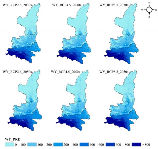 Precipitation change scenario: we kept the land use data input by the water yield module unchanged (based on the land use data in 2020) and, using the precipitation changes, we input the precipitation in the 2030s and 2050s in sequence. The difference between the simulated water yield under this scenario and the simulated water yield with simultaneous changes at the same time in terms of precipitation and land use was the impact of precipitation changes on water yield changes. In this way, the impact of climate change on water yield was discussed if the underlying surface did not change.