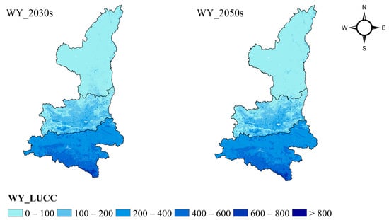 According to the spatial distribution map of water yield in Shaanxi Province under the land use change scenario (Figure 13), compared with the precipitation change scenario, the high-value area of water yield in Shaanxi Province will transfer from the Jialing River basin in the southwest of Shaanxi Province to the Daba Mountain area in Ankang City, and the overall change in water yield will be small. The proportion of areas with a water yield depth of >800 mm will be relatively small, and the changes in the median and low value areas is predicted to be small.