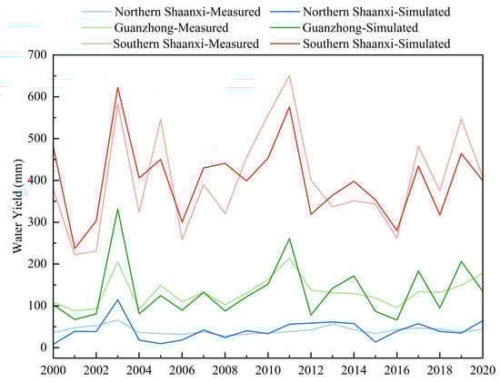 The comparison results of recorded total water resources and simulated water yield in northern Shaanxi, Guanzhong, and southern Shaanxi.