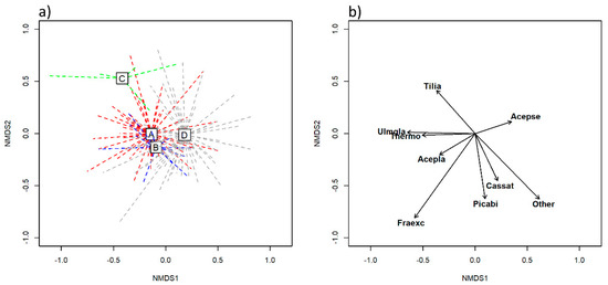 Two-dimensional NMDS ordination based on the composition of tree species. (a) The distribution of mapped polygons in the ordination space, distinguishing among four forest habitat subtypes: A (red) – Acer pseudoplatanus-Ulmus glabra stands, B (blue) – Fraxinus excelsior stands, C (green) – Tilia sp. stands and D (grey) – Acer pseudoplatanus stands on more acidic soils with an admixture of Castanea sativa. Squares with letters inside correspond to the centroids of the habitat subtypes. (b) Significant (p < 0.05) variables (tree species), which are coded as follows: Acepla—Acer platanoides, Acepse—Acer pseudoplatanus, Cassat—Castanea sativa, Fraexc—Fraxinus excelsior, Other—a group of other tree species (e.g., Abies alba, Prunus avium, Carpinus betulus), Picabi—Picea abies, Thermo—a group of thermophilous tree species (e.g., Ostrya carpinifolia, Fraxinus ornus), Tilia—Tilia platyphyllos/T. cordata, Ulmgla—Ulmus glabra.