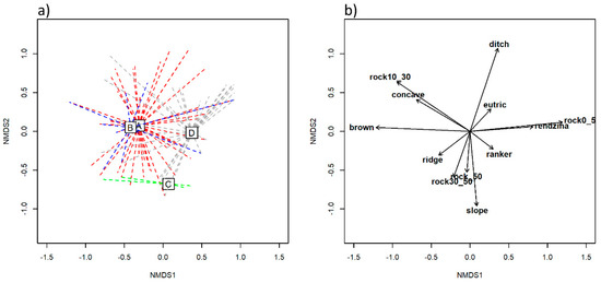 Two-dimensional NMDS ordination based on relief, rockiness/stoniness and soil type data. (a) The distribution of mapped polygons in the ordination space, distinguishing four forest habitat subtypes: A (red)—Acer pseudoplatanus-Ulmus glabra stands, B (blue)—Fraxinus excelsior stands, C (green)—Tilia sp. stands and D (grey)—Acer pseudoplatanus stands on more acidic soils with an admixture of Castanea sativa. Squares with letters inside correspond to the centroids of the habitat subtypes. (b) Significant (p < 0.05) variables, abbreviated as follows: rock0_5 = rockiness/stoniness 0%–5%, rock10_30 = rockiness/stoniness 10%–30%, rock 30_50 = rockiness/stoniness 30%–50%, rock_50 = rockiness/stoniness above 50%, brown–brown calcareous soils, eutric–eutric brown soils. Labels for other variables are considered to be self-explanatory.
