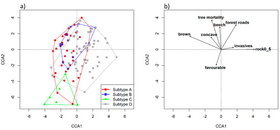 The final CCA model included eight explanatory variables, which collectively explained 16.2% of the variation in tree community composition. The constraining variables (p < 0.05, listed in descending order of importance) were the following: category of rockiness 0%–5%, tree mortality, brown soils on limestone and dolomite, beech competition, concave relief, presence of forest roads, presence of invasive plant species and favourable conservation status (Figure 6). The distribution of samples (polygons) in the CCA diagram revealed that subtype C was clearly positioned away from the other three subtypes and that subtype A and subtype B highly overlapped. Additional patterns inferred from the CCA analysis were a negative association between threats and favourable conservation status (gradient along the CCA axis 2) and that subtype D differed from subtypes A and B mostly in terms of rockiness (correlated with soil type) and the presence of invasive plants (gradient along the CCA axis 1; Figure 6).
