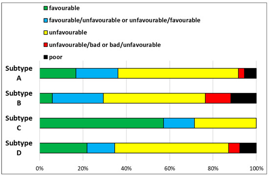 The studied subtypes exhibited prominent differences regarding their conservation status (Figure 7). Overall, subtypes could be ranked from those having the most favourable status to those having the least favourable status in the following order: subtype C > subtype A > subtype D > subtype B. More than half of all polygons in subtype C had favourable conservation status and no polygon was assigned to the poor status. In contrast, subtype B had almost 25% of polygons with either poor or unfavourable/poor status. Across all subtypes, the class of unfavourable conservation status had the highest mean proportion (45.9%) (Figure 7).