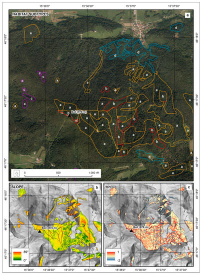Spatial maps illustrating the digital orthophoto (a), terrain steepness (SLOPE, b) and Topographic Position Index (TPI, c). Higher TPI values denote convex topography (e.g., ridges), whereas lower TPI values were typical for concave terrain (e.g., dolines). The letters within the polygons represent forest habitat subtypes as follows: a—Acer pseudoplatanus-Ulmus glabra stands, b—Fraxinus excelsior stands, c—Tilia sp. stands and d—Acer pseudoplatanus stands on more acidic soils with admixture of Castanea sativa.
