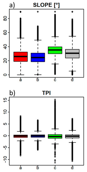 Boxplots showing the distribution of values derived from the ALS data (a) SLOPE–terrain steepness and (b) TPI – Topographic Position Index, for each of the studied forest habitat subtypes: a (red)—Acer pseudoplatanus-Ulmus glabra stands, b (blue)—Fraxinus excelsior stands, c (green)—Tilia sp. stands and d (grey)—Acer pseudoplatanus stands on more acidic soils with an admixture of Castanea sativa. Subtypes not sharing the same letter (below boxplot) significantly differ at p < 0.001 according to the Tukey post-hoc tests with ANOVA.