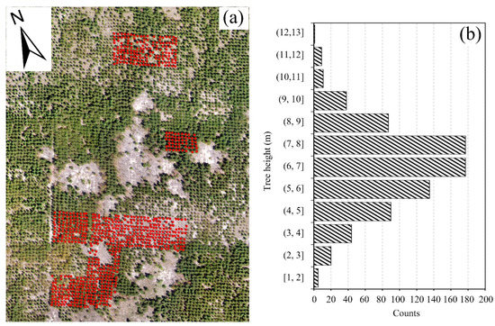 The distribution of field-surveyed trees (a) and tree heights (b).