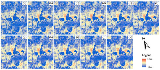 CHMs at different flight altitudes. ((a): 40 m; (b): 60 m; (c): 80 m; (d): 100 m; (e): 120 m; (f): 140 m; (g): 160 m; (h): 180 m; (i): 200 m; (j): 220 m; and (k): 240 m).