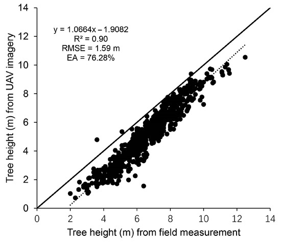 The determination coefficient (R2), RMSE, and estimation accuracy (EA) were used to evaluate the accuracy of the tree-height results (Equations 4–6) [60,61,62]. R2 represents the goodness of fit between tree heights derived from the UAV and the field survey. The RMSE is used for error estimation, with a lower value of the RMSE indicating a higher accuracy of tree-height results achieved, while a value of EA closer to 100% represents a higher accuracy of tree-height results achieved.