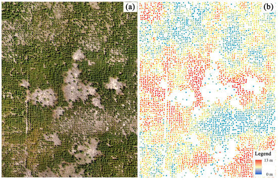 The results of Casuarina equisetifolia identification and tree-height detection at the flight height of 80 m. (a) UAV image and (b) results of ITD and tree-height detection.