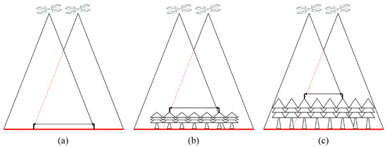 Example of the influence of tree height on the overlaps for UAV images in a (a) non-forest area; (b) forest with low tree height; and (c) forest with high tree height.