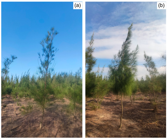 C. equisetifolia with different crown shapes (a,b) in the field.