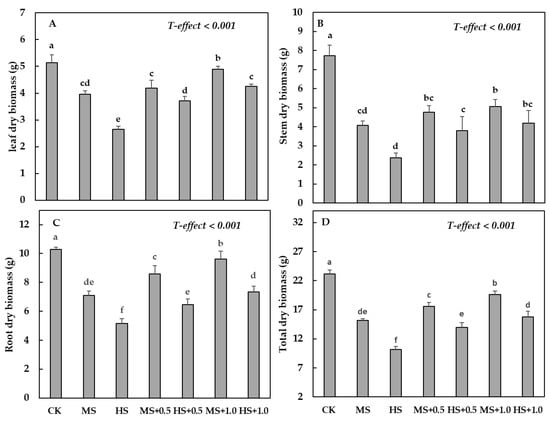 Mean leaf dry biomass (A), stem dry biomass (B), root dry biomass (C) and total dry biomass (D) under MS, HS, MS + 0.5, HS + 0.5, MS + 1.0 and HS + 1.0. in M. alba saplings. Small letters represent the significant differences between treatment means (T-effect) at p < 0.05.