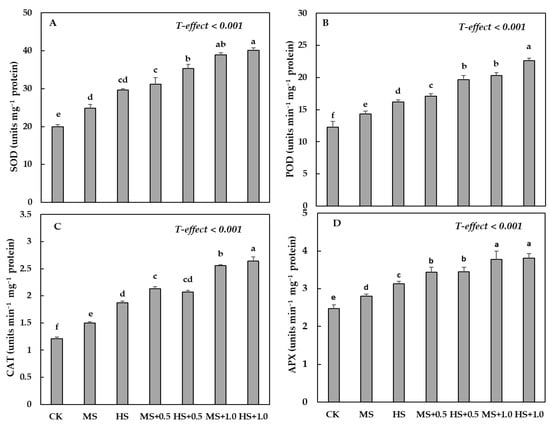 The average values of SOD (A), POD (B), CAT (C), and APX (D) under MS, HS, MS + 0.5, HS + 0.5, MS + 1.0 and HS + 1.0 treatments and foliar spray of SA in M. alba saplings. Small letters represent significant differences between treatment means at (T-effect) p < 0.05.