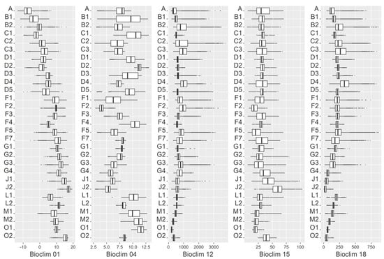 Boxplots of the climatic range of the CaPV classes within the parameters. Bioclim 01 = annual mean temperature (°C); Bioclim 04 = temperature seasonality (Std (monthly means)); Bioclim 12 = annual precipitation (mm/year); Bioclim 15 = precipitation seasonality (CV); Bioclim 18 = precipitation of warmest quarter (mm/quarter). Specifications of the CaPV classes are given in Table 1.
