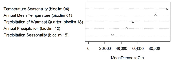 Data preparation and modeling were performed with RStudio version 1.3.959 [22]. The randomForests 4.7-1 package [23] was applied to fit a multiclass model for the 29 CaPV classes. Random forest combines several randomized decision trees, where randomness is introduced by training each decision tree on a randomly sampled subset of the training data. Random forests have been shown to efficiently handle large training datasets with many nominal classes [24]. Further advantages of this algorithm are a very high classification accuracy, its ability to model complex interactions among predictor variables, to model nonlinear and nonmonotonic relationships, to maximize information content in incomplete datasets, the capability to determine variable importance and its robustness to overfitting [25,26]. In comparison with other multiclass model approaches, random forests show a solid predicting performance, usually ranking among the top classifiers [2,27,28,29]. Random forests can cope with complex interactions and even highly correlated predictor variables [30]. To still avoid collinearity and keep the model as simple as possible to avoid overfitting, we selected the variables using the variance inflation factor (VIF) analysis [31]. We dismissed variables until there was no evidence of collinearity (VIF) < 5. The model was fitted with the variables Bioclims 1, 4, 12, 15 and 18. For details of the parameters see Table 2. The random forest algorithm “spreads” the variable importance across all variables. The importance of the variables (Figure 1) is explained as the mean decrease in Gini and indicates how each variable contributes to the homogeneity of the nodes and leaves in the resulting random forest. It describes the total decrease in node impurity from using a variable on the binary splits in the nodes, averaged over all trees [32,33]. If the variable is useful, it tends to split mixed-labeled nodes into pure single class nodes. With random forests, it is possible to visualize the effect of each variable for each vegetation class and make the partial dependence visible in plots. This opens up the possibility to compare the modeled effects of the variables on each class with findings in vegetation science.