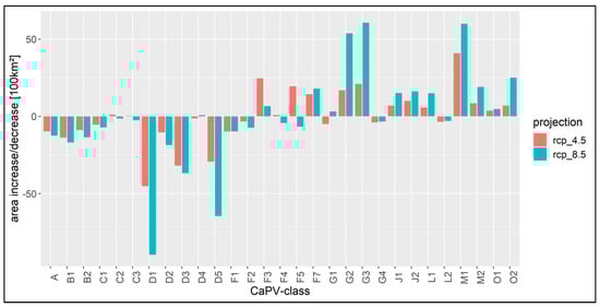 Area changes in potentials (100 km²) of the climate-adapted potential vegetation classes (CaPV class) ‘solid bars’ until 2070 for RCP 4.5 ‘red’ and RCP 8.5 ‘blue’.