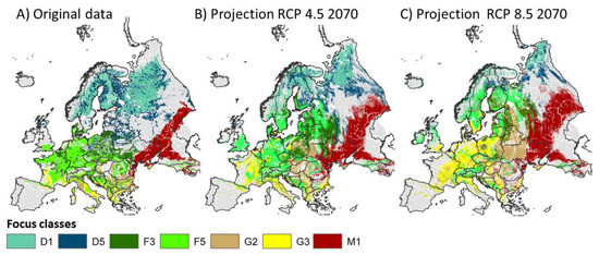 The map of the natural vegetation of Europe consists of mosaics of homogeneous growth areas [10]. In the first two hierarchies of the map, these growth areas are differentiated by climatic site factors. Edaphic conditions are used to differentiate classes in the lower hierarchies. The vegetation class for each growth area was determined by experts by means of bioindicators, edaphic and climatic conditions. The PNV classes are therefore based on climatic factors, but the class boundaries are not defined as parametric values. To estimate potential changes in the site-equivalent vegetation types of the current PNV of Europe for different climate change scenarios, we established the concept of climate-adapted potential vegetation (CaPV). CaPV is the vegetation that would have the greatest potential to develop in an area under certain climatic conditions. To do so, we applied habitat suitability modeling (HSM) to relate hypothetical species’ field observations (PNV) data to environmental predictor variables. Current climatic parameters from the time slice 1979–2013 were used to fit a multiclass HSM to 29 zonal PNV classes. To examine the effect of varying atmospheric CO2 concentrations for the time slice 2061–2080, we applied two different Representative Concentration Pathways (RCPs), RCP 4.5 and RCP 8.5, to project the CaPV classes. All scientific nomenclature of plant taxa was used according to Simpson (2019) [14]. The PNV classes with the exact wording as used by Bohn and Gollub et al. (2000) [10] are accessible in the appendix for comparison (Appendix A).